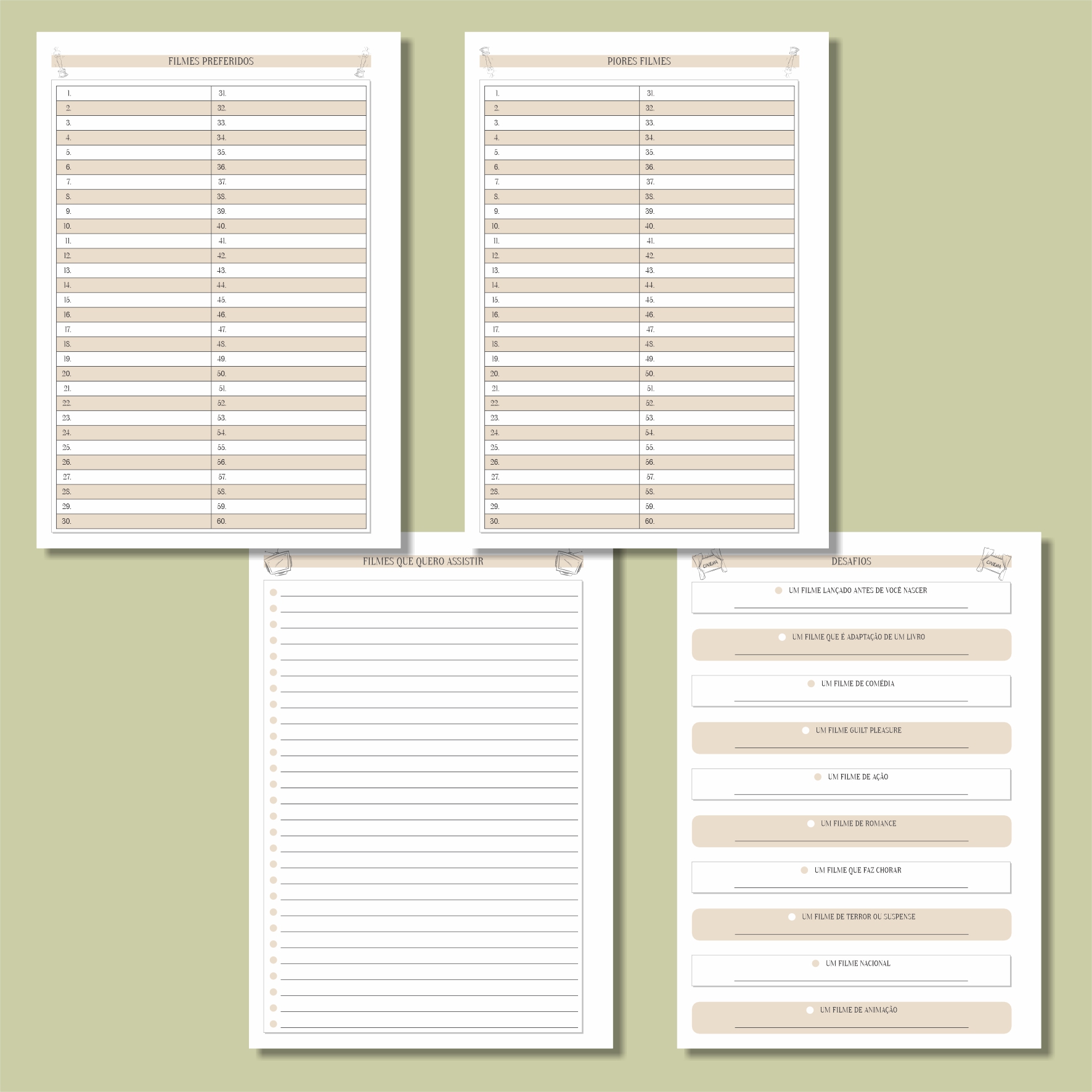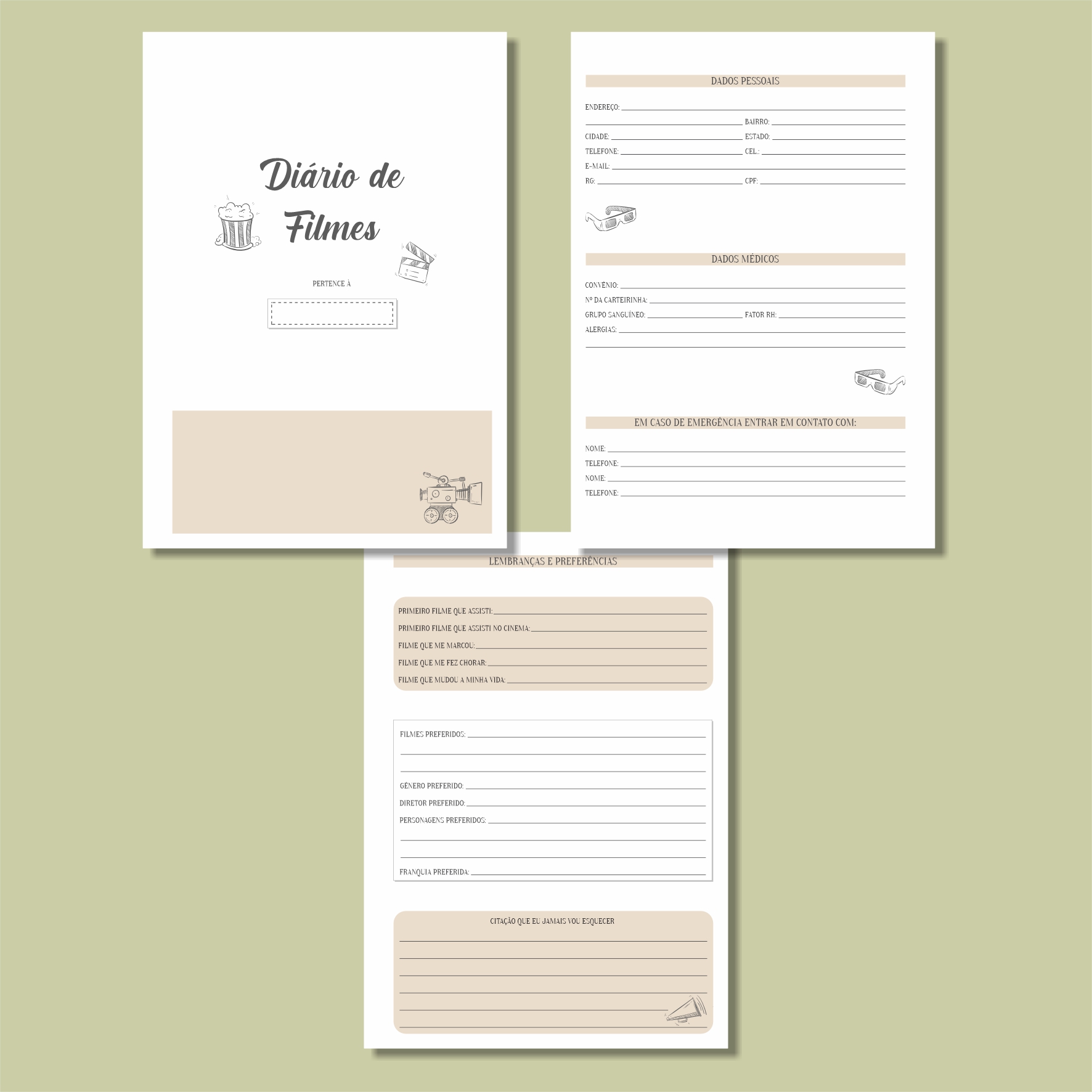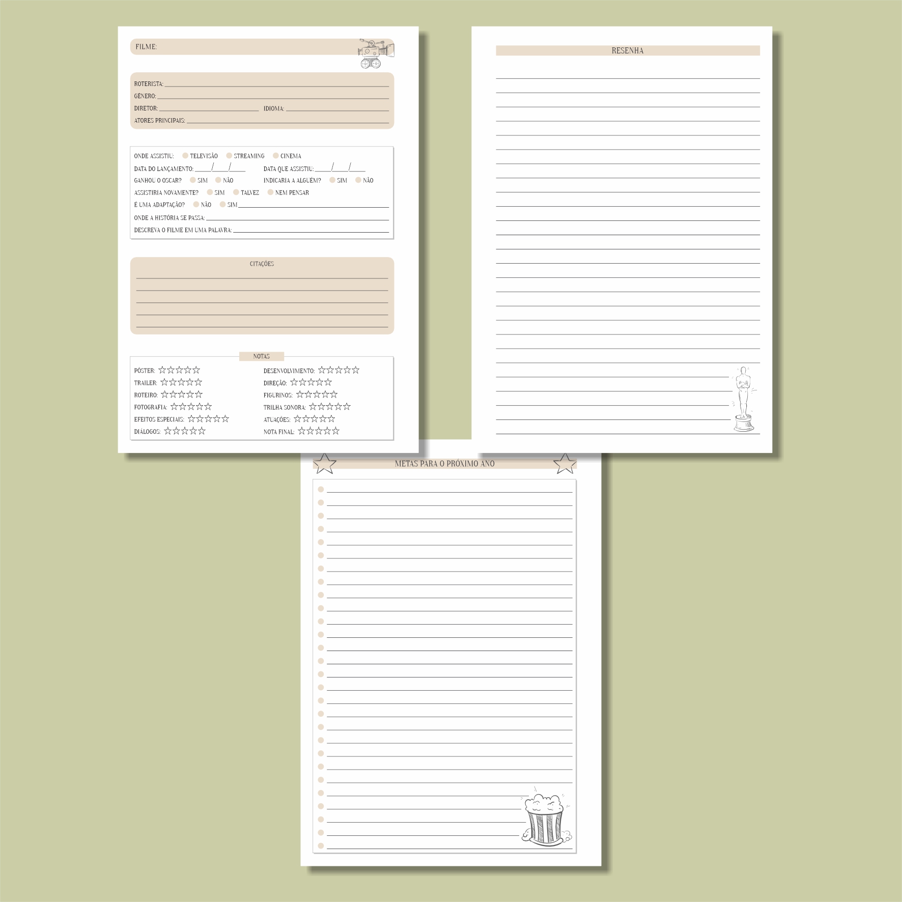 • Com um design minimalista, esse diário é essencial para quem ama assistir filmes. Com ele, você consegue criar uma lista dos filmes que quer assistir, fazer um registro dos que assistiu e guardar os melhores momentos de cada um deles. Além disso, você pode escolher se quer com espaço para resenha ou não.