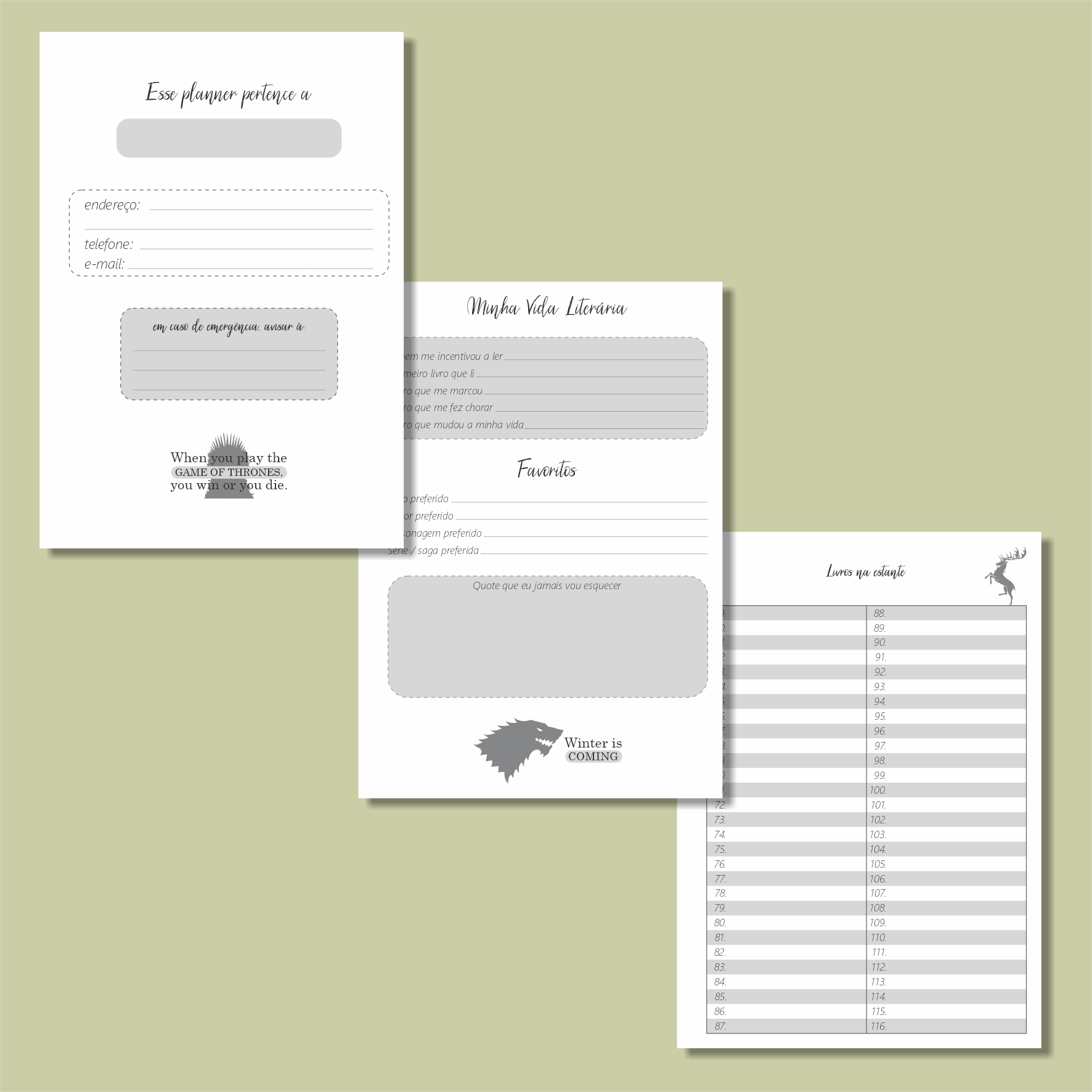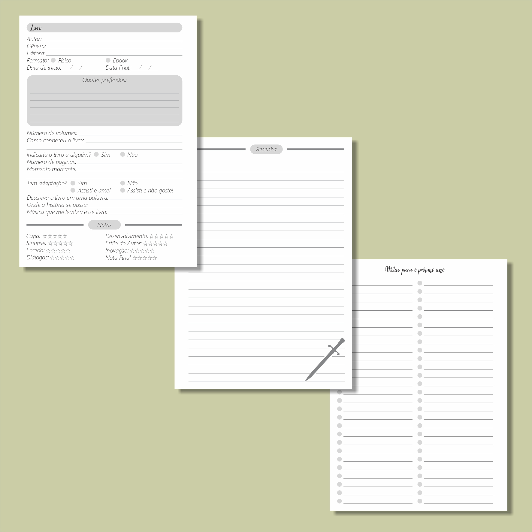 – Controle de livros lidos no ano, com espaço para nota, informações gerais do livro e resenha (com espaço para 96 livros).