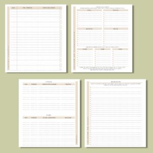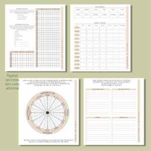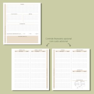 – Planejamento financeiro (uma folha frente e verso por mês) – despesas fixas, despesas variáveis, despesas de cartão de crédito; entradas, investimentos e balanço mensal.